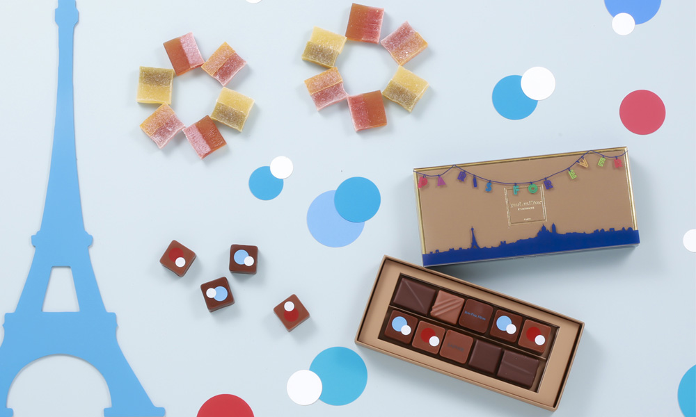7月1日より、今夏のスポーツ観戦にちなんで「フェスティヴァル デテ コレクション」を発売しています。ジャン=ポール・エヴァンでは、お祭りを盛り上げる花火のようなトリコロールカラーのボンボン ショコラをご用意しました。