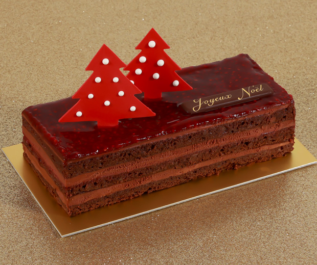 ヴェネズエラ産カカオを使用したムースと、フランボワーズのコンフィチュール、アーモンドとカカオのビスキュイを重ねたガトー。ショコラでできた赤いツリーと、艶やかなフランボワーズのコンフィチュールがクリスマスを彩ります。