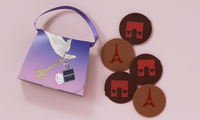 品を8月31日(土)まで、全ブティック(チョコレート バー 丸の内店を除く)およびオンラインブティックで販売しています。凱旋門をデザインした限定BOXには、小夏風味のキャラメルをミルクチョコレートでコーティングした「エテ」と定番ショコラが入っています。ジャン=ポール・エヴ