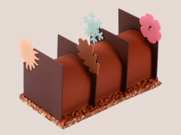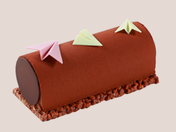 ビュッシュ レクレ エヴァン エヌコロサンのカメルーン産カカオのムースと、キャラメルクリーム、ビスキュイショコラ、ヘーゼルナッツとキャラメル風味のミルクチョコレートのクルスティヤン